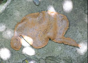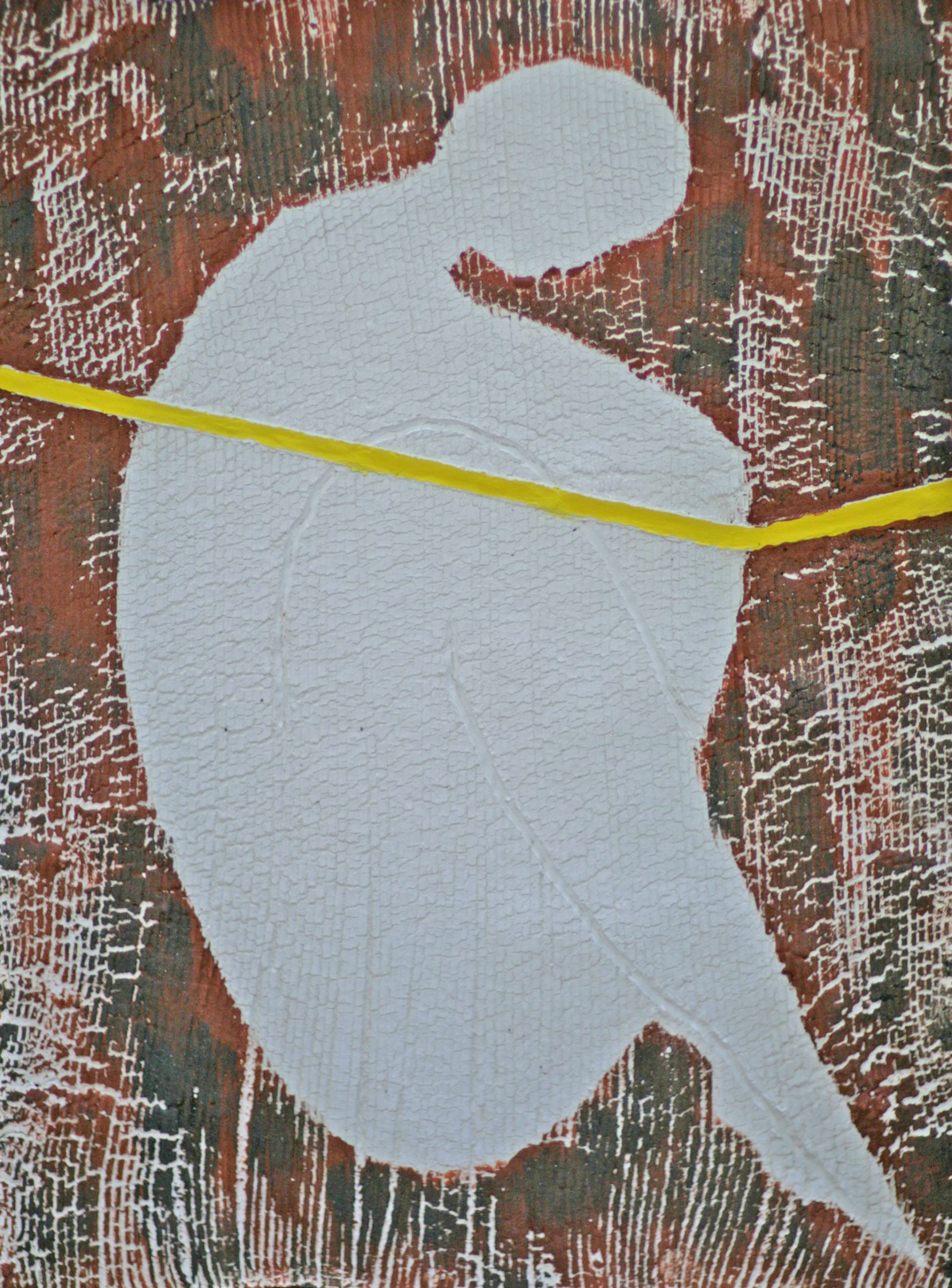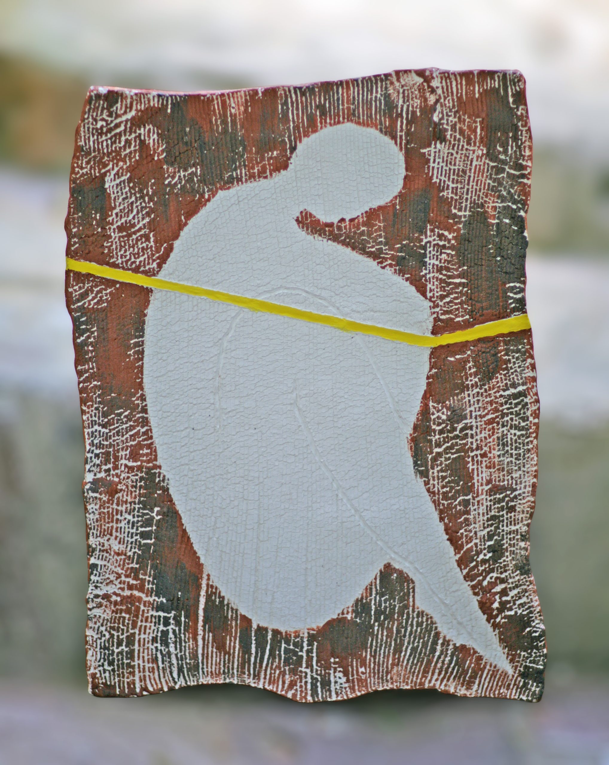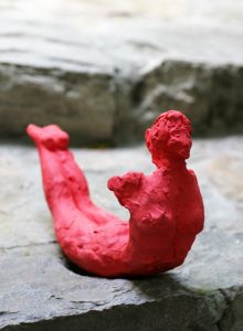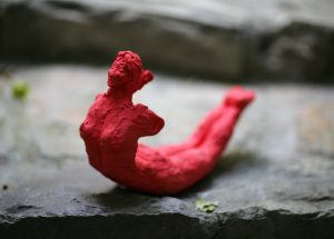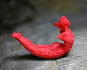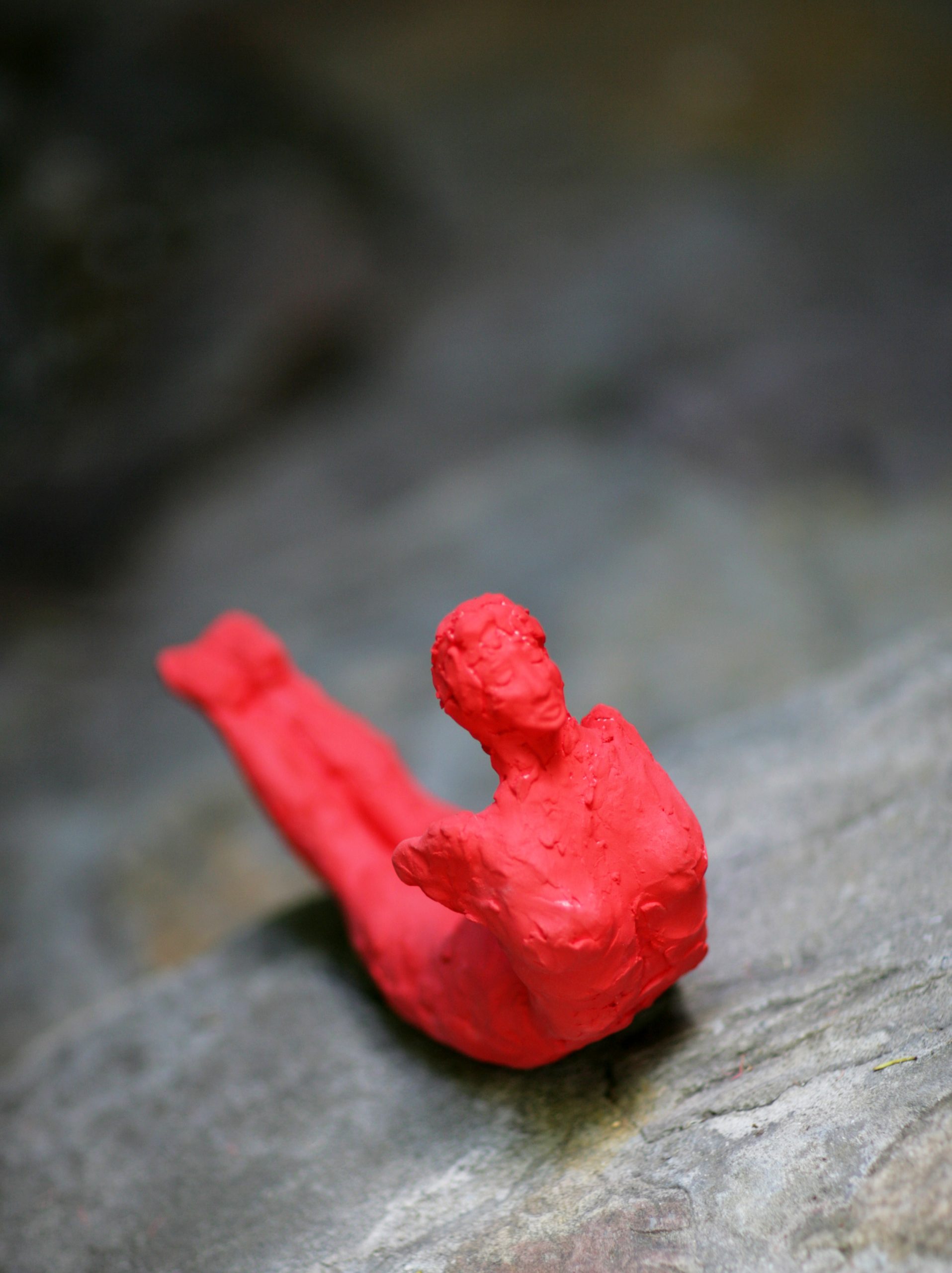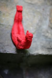 TITLE: floating I, MATERIAL: buff clay with red spray paint, LENGTH: approx 28cm, YEAR: 2025