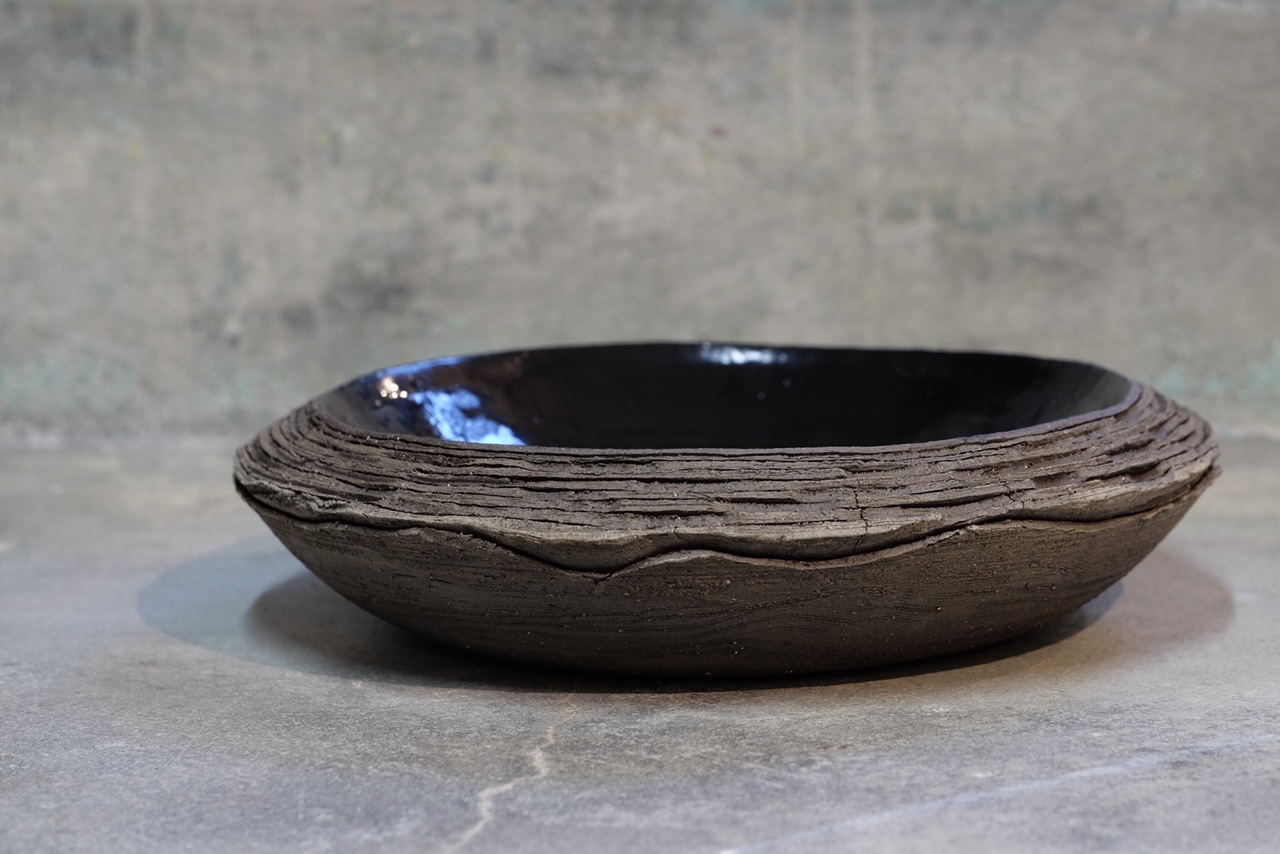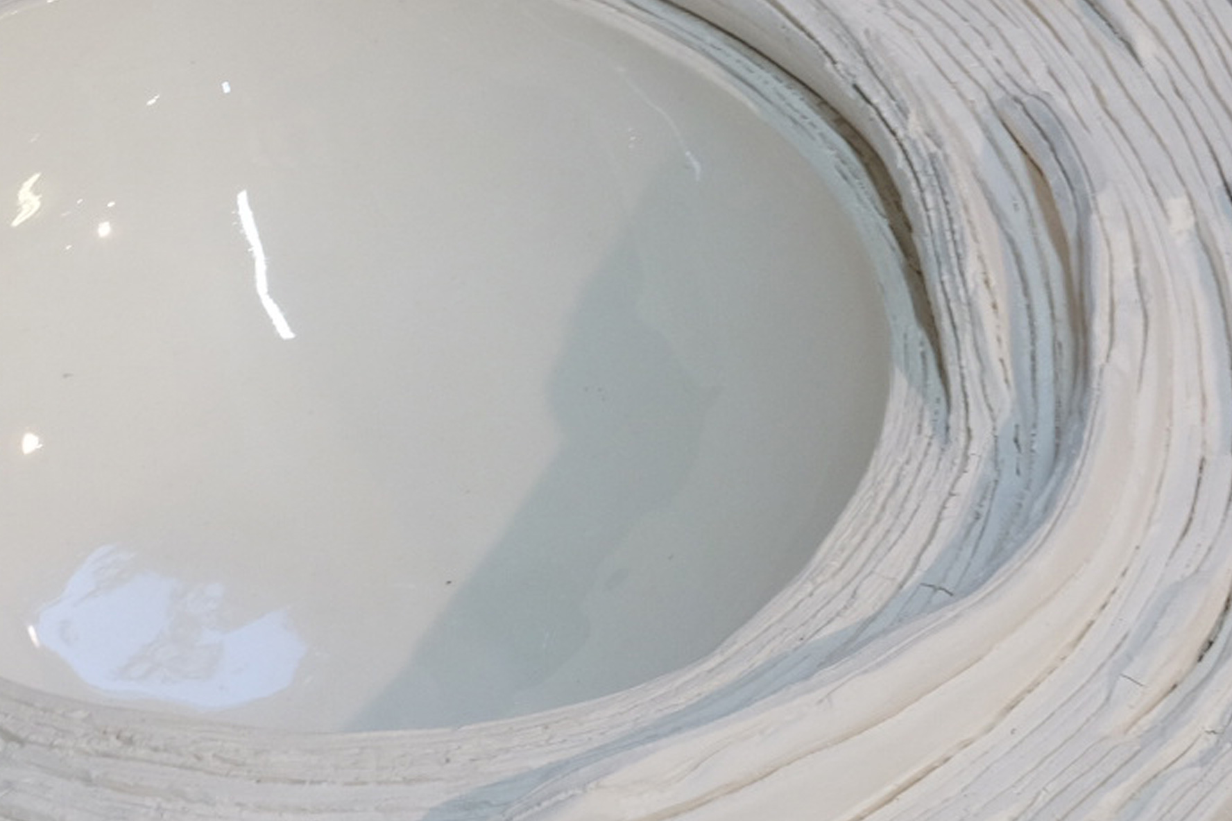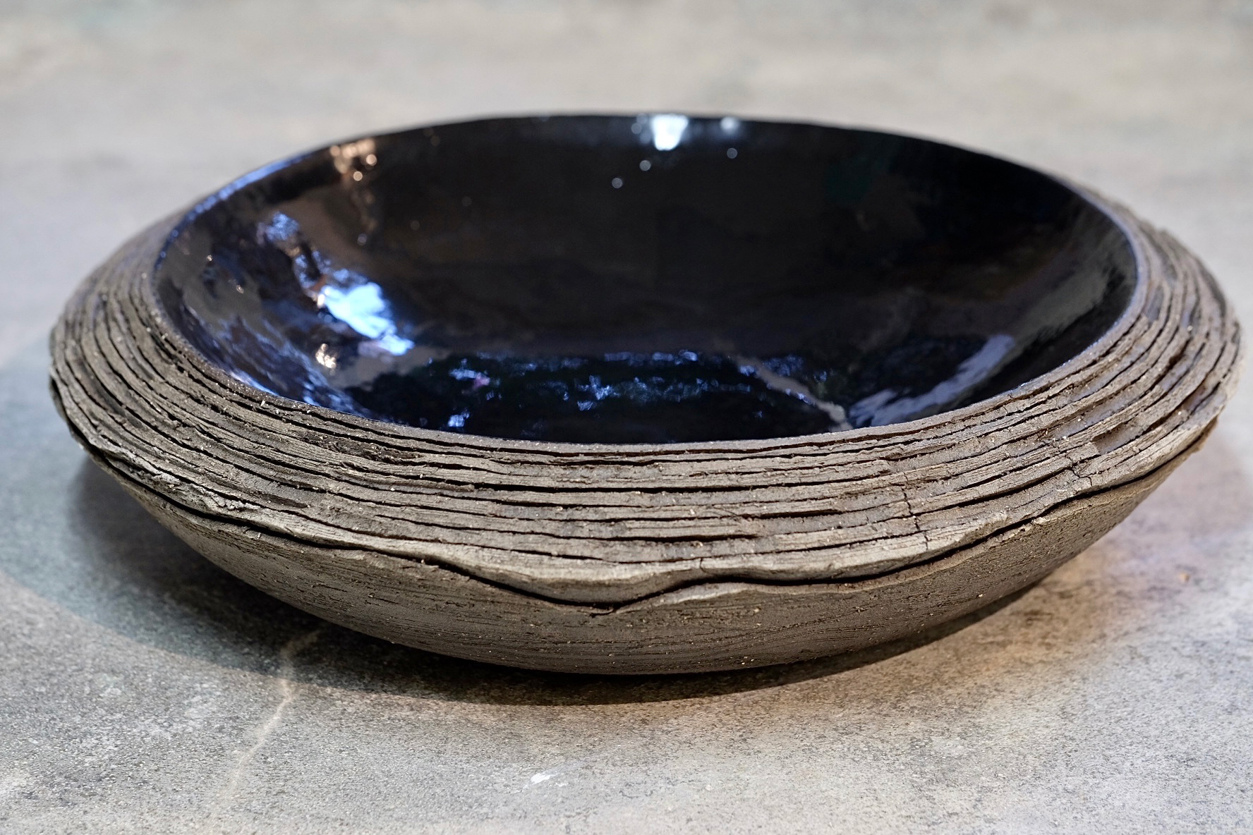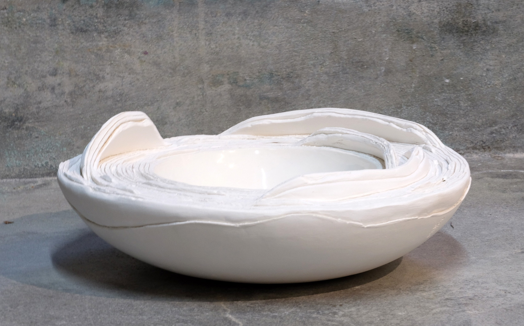 The layering holds space as an active material: sometimes open as a vessel, sometimes sealed, sometimes staged with small figurative forms at the rim of emptiness. In some works the circles break, erode, and fall away, leaving the loop interrupted—an insistence on fragmentation rather than closure. Built as strata, the forms explore time as a circular event—held, compressed, and sedimented in layers of clay. Across these variations, the repeated circle becomes a way to test how form can carry time, containment, and relation.
