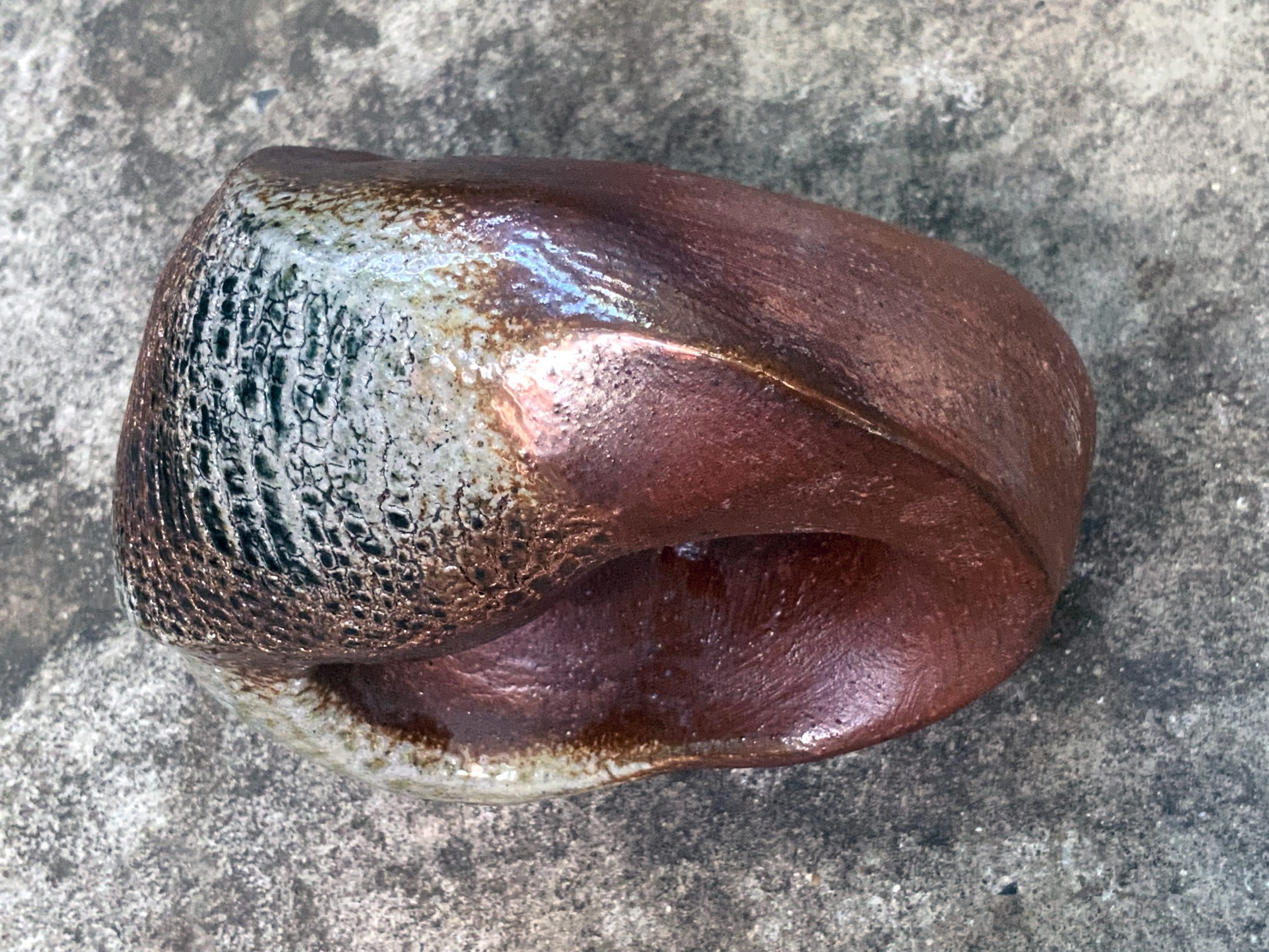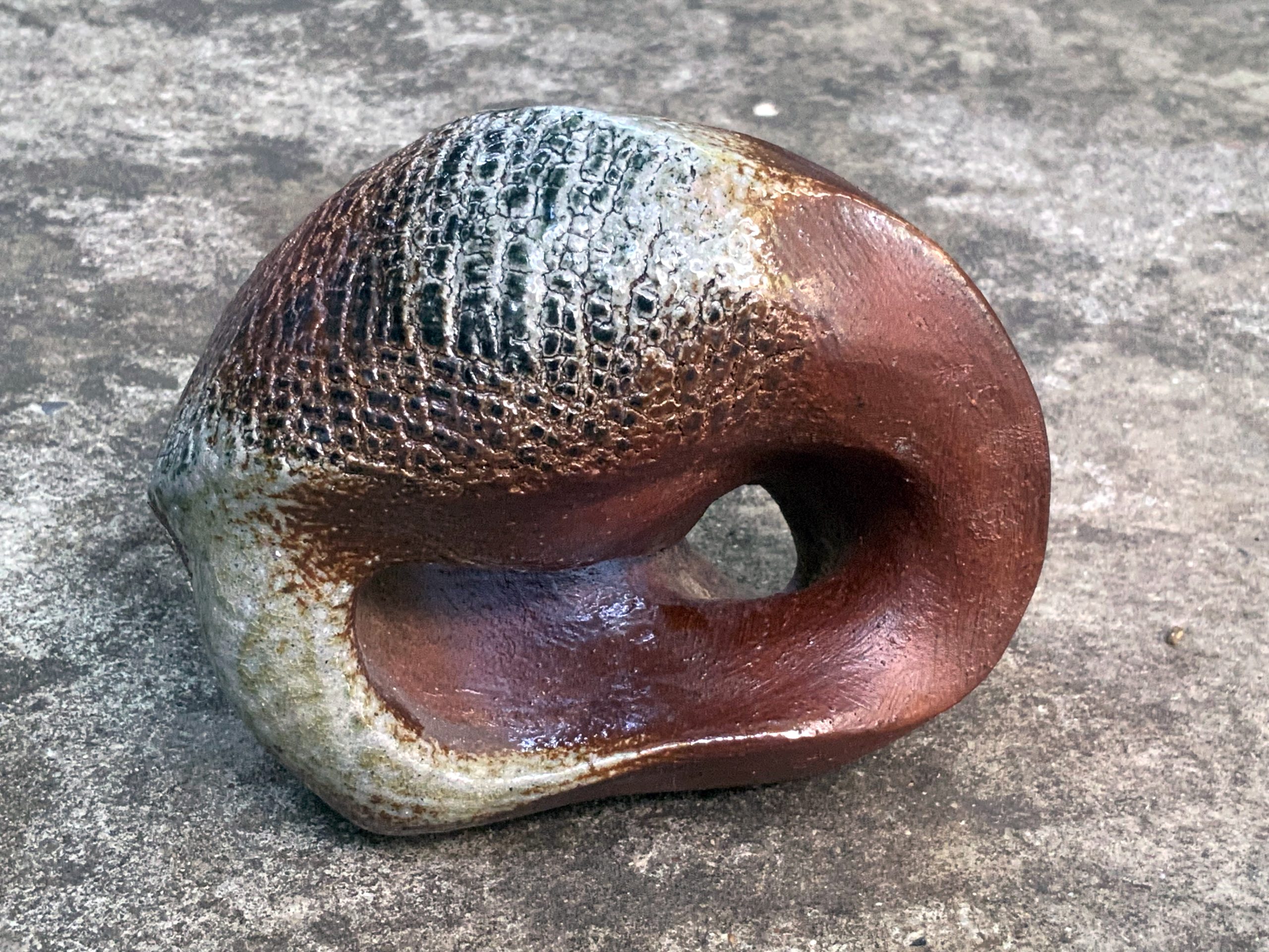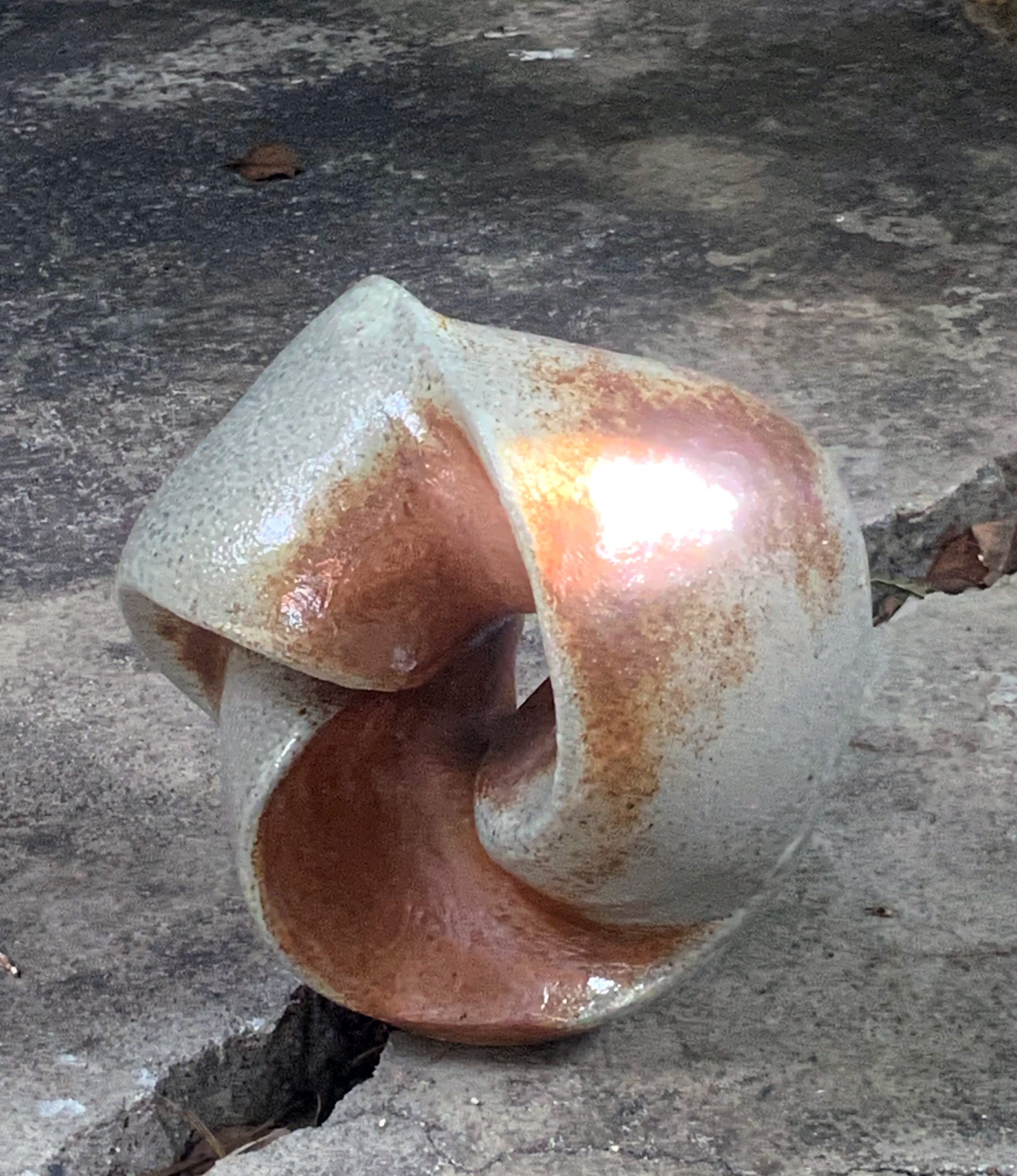 A continuous turn is extended into volume: loops fold back into themselves and open a central void. The surfaces remain materially direct—most works were soda-fired—so flame and salt add their own vocabulary to the surface structure. Rather than modelling a literal Möbius band, each piece acts as a volumetric echo: a study of continuity and inversion, where inside and outside refuse a stable hierarchy and movement is held in still, tactile mass.
